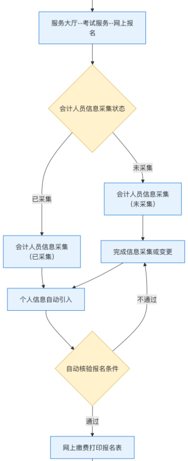 (二)信息采集。为确保顺利报名,即日起拟报考人员可登录“全国会计人员统一服务管理平台”提前进行注册和信息采集。已经完成采集的人员,在考试报名开始后无需重复上传资料,直接报考相应层级的考试科目。